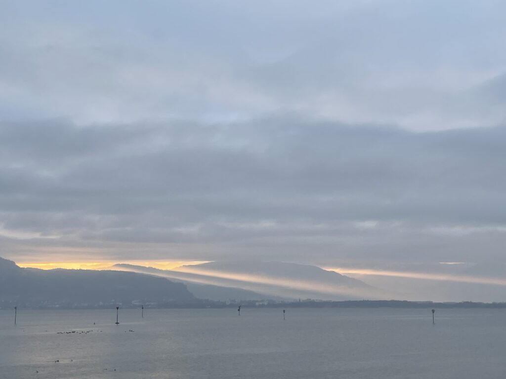 Das Morgenlicht des neuen Jahres kommt von Osten über den See …. der Zauber des Anfangs ist vielversprechend ….